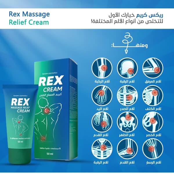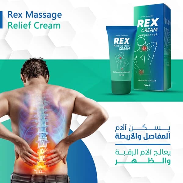 The medical massage cream - Rex works to relieve pain by anesthetizing the area and raising its temperature by increasing blood perfusion in it, thanks to the fact that mint extract and clove extract contain the menthol and eugenol compounds, and also the anti-inflammatory effectiveness where ginger extract and capsicum contain gingerol and capsaicin compounds that inhibit the synthesis of inflammatory prostaglandin, and also ginseng extracts, Ginkgo biloba, sunflower and pomegranate contain compounds such as ginsenosides and flavonoids that are similar in their mechanism of action to the action of steroid anti-inflammatory drugs such as cortisone but without any side effects.
